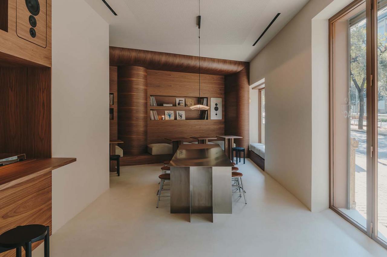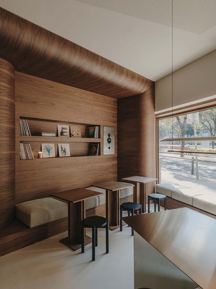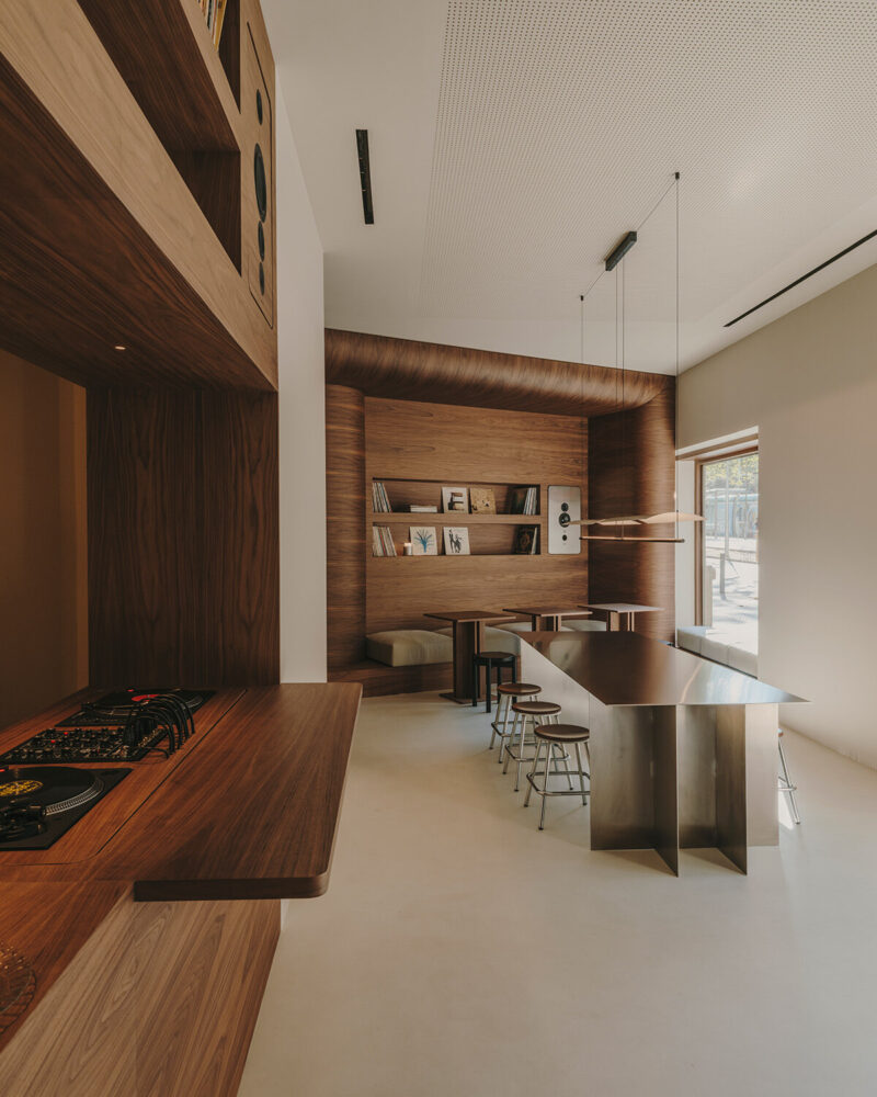 Toward the rear of the café, Serra shaped a sweeping walnut installation that folds up from the wall and curves into the ceiling, creating an alcove devoted to listening. Within it, stainless steel Bloom Island speakers, low walnut tables, and custom seating combine with a disco wall lamp by Jordi Miralbell and Mariona Reventós to heighten the atmosphere. It is intimate but not closed, designed to hold focus without shutting the room away. The façade carries this same language outward: clad in iroko wood stained to match the walnut inside, punctuated by circular carvings that reference speaker cones, and marked by a glowing lamp that sets the tone before you step inside.