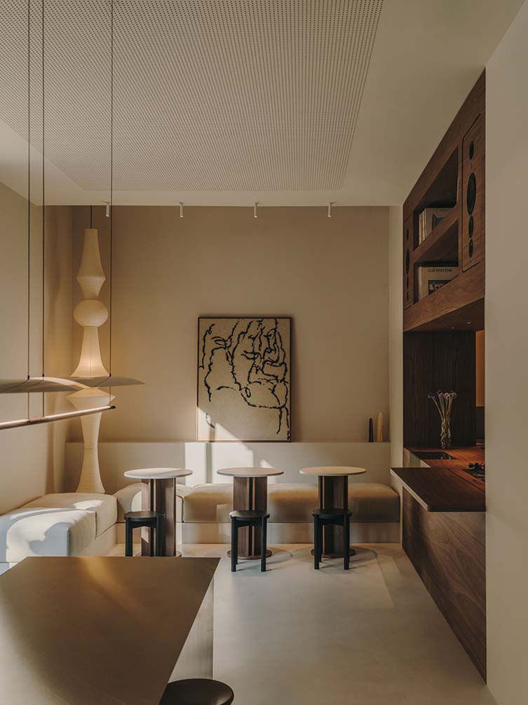The interior is by Isern Serra Studio, whose work across Barcelona is marked by an ability to reduce, refine, and shape environments that invite focus. Here, Serra works with a palette of walnut, stainless steel, and microcement across 95 square metres. The space is structured to encourage lingering rather than passing through. Every detail feels deliberate: the way light falls across wood grain, the acoustics shaped by curved timber walls, the balance between open lounge and intimate alcove.