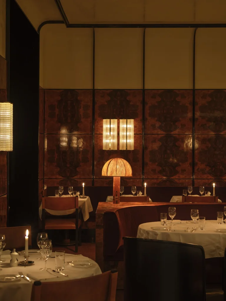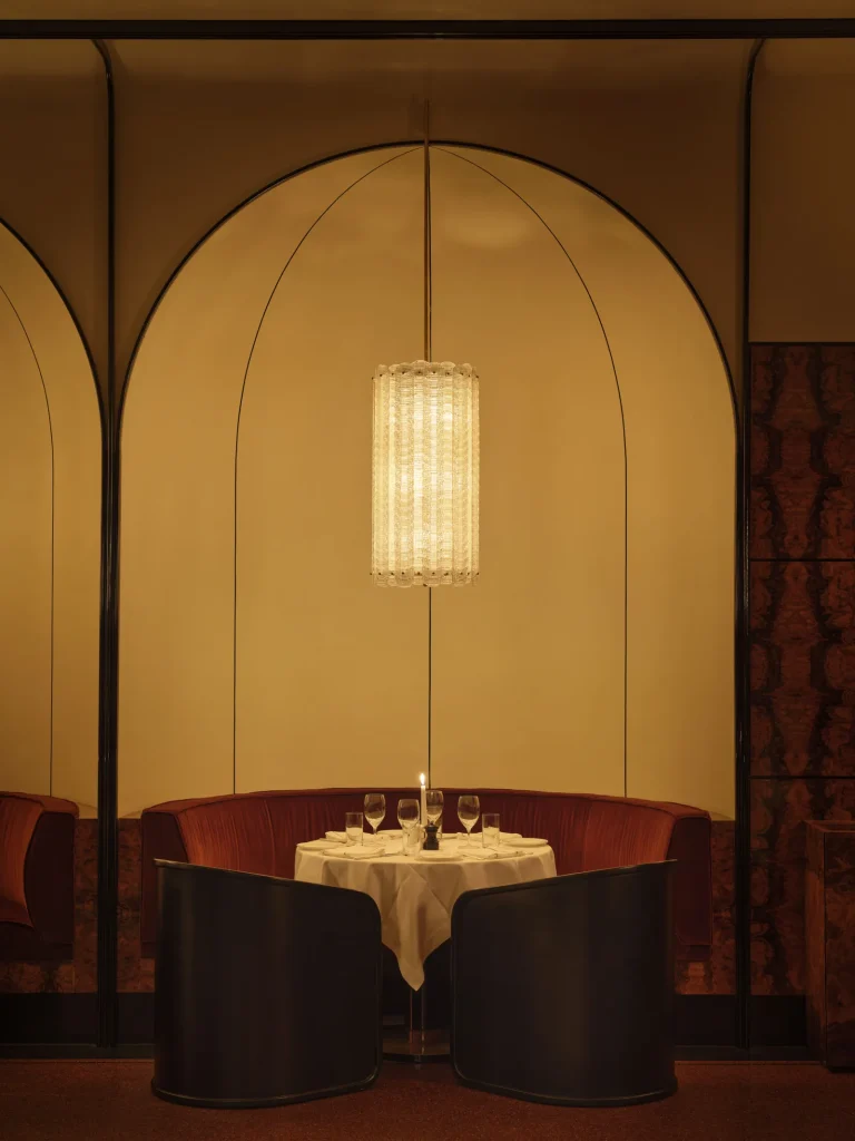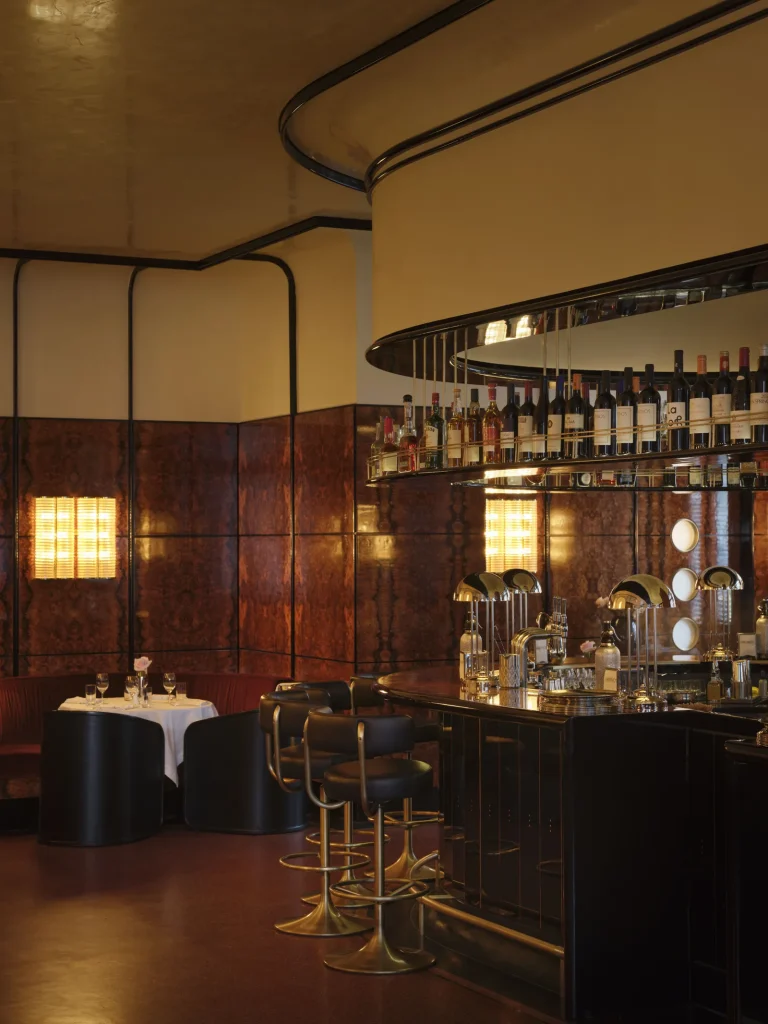 The interior was crafted with Milanese design studio Studio Dragò, led by co-founder Fanny Baeur Grung. Their work here strikes a balance between old-school warmth and modern restraint. Glossy wood panelling meets burgundy Venetian terrazzo underfoot, lacquered black detailing frames a geometry that feels both rooted and refined, and custom Murano glass lamps lend a soft glow that keeps the space feeling intimate from morning coffee through to a late negroni.
